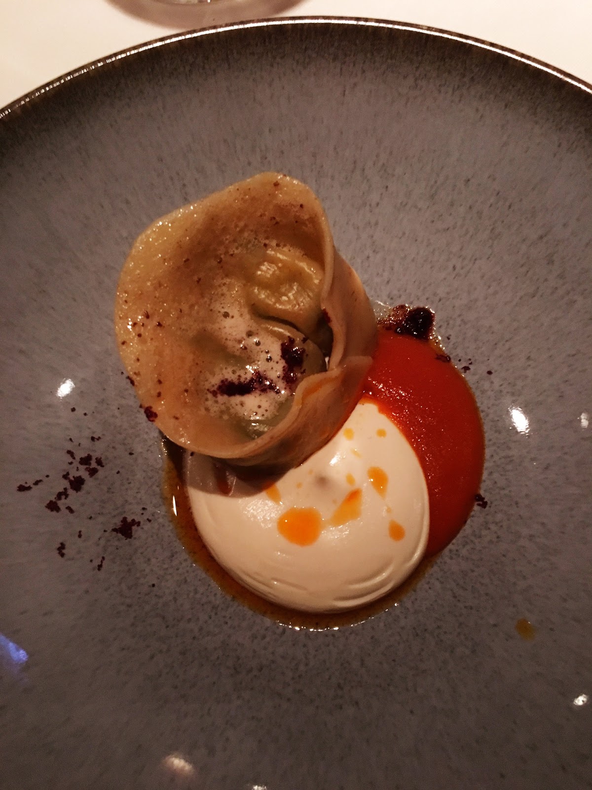 | Whole wheat vegetable ravioli on a bed of buffalo milk yogurt & baked tomato-garlic sauce @Mikla |